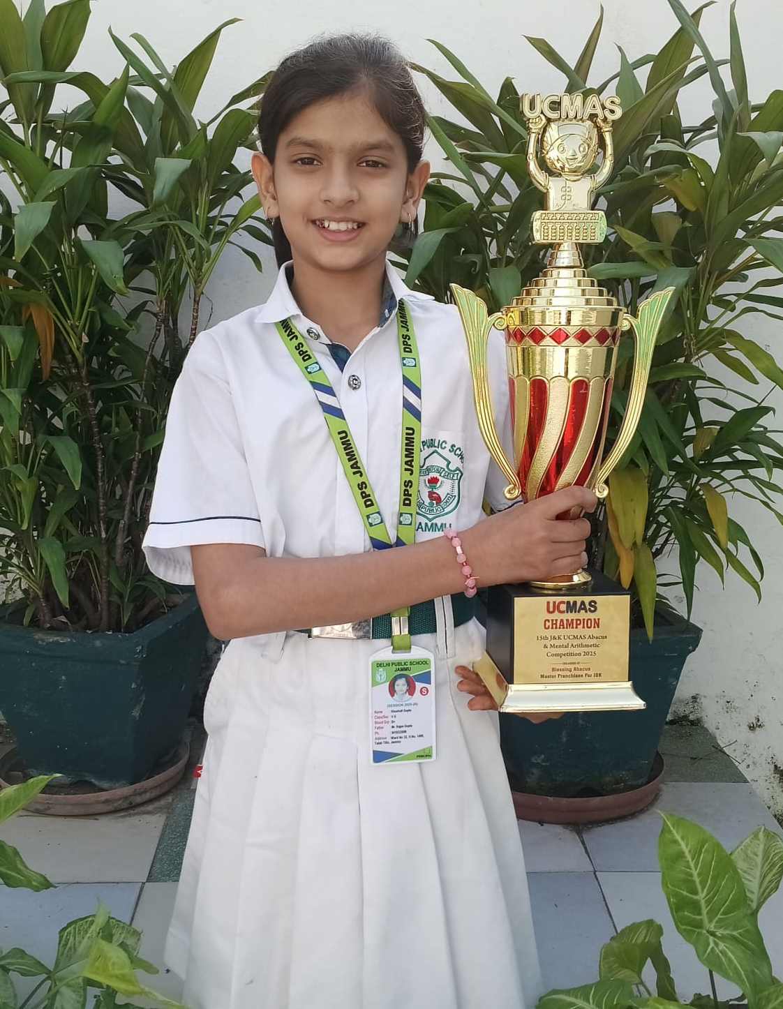 Early Times Report JAMMU, Oct 13: Khushali Gupta, a student of Class V-G at Delhi Public School Jammu, has brought laurels to the institution by winning the Champion Trophy in the 15th J&K UCMAS Abacus & Mental Arithmetic Competition 2025. The competition was held on 28th September 2025 at GDCT, Jammu, and the results were declared on 5th October 2025. Khushali secured the top position in the Undergoing Basic Level, Category-Z, and was awarded a Champion Trophy along with a cash prize of ?1100/- for her outstanding performance. UCMAS (Universal Concept of Mental Arithmetic System) is a globally recognized child development program that uses the abacus as a tool to enhance mental arithmetic and cognitive abilities. Aimed at children aged 4-13, the program not only improves calculation speed but also fosters critical skills such as memory, concentration, and problem-solving. The school management, under the visionary leadership of President-RCT, M.K. Ajatshatru Singh, Distinguished PVC, Kunwarani Dr. Ritu Singh, and Director, S.S. Sodhi, along with Principal, Ruchi Chabra, congratulated Khushali and her proud parents on this remarkable achievement. They also extended their best wishes for her continued success in all future endeavours. |