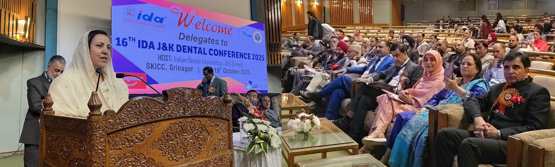 Dentists not merely tooth doctors; they are integral to preventive, systemic healthcare: Sakeena Itoo | | | Early Times Report SRINAGAR, Oct 18: Minister for Health and Medical Education, Social Welfare and Education, Sakeena Itoo today addressed the 16th Indian Dental Association J&K Dental Conference at Sher-i-Kashmir International Conference Centre (SKICC) here today. Addressing the gathering, Minister Sakeena lauded the vital contributions of dental professionals in strengthening the healthcare system of Jammu and Kashmir. She underlined that oral health is cornerstone of overall well-being and must be integrated more prominently into general healthcare policies. The Health Minister highlighted that oral health was commonly an overlooked aspect for most of the individuals, but in recent times people have understood that oral health plays a critical role in preventing systemic diseases like diabetes, cardiovascular ailments and respiratory infections. The Health Minister added that in recent years oral hygiene practices and dental check-ups have emerged as an essential routine for people, especially the young generation. She urged the dentists and participants to aware people about adopting regular oral hygiene practices and dental check-ups an essential part of their healthcare routine. Acknowledging various issues faced by dental doctors, Minister Sakeena emphasized that dental doctors are as important as MBBS doctors and dentists need to be given due recognition at par with other kind of doctors. "Dentists are not merely tooth doctors; they are integral to preventive and systemic healthcare. It is high time that dental professionals are given due recognition and status, at par with MBBS doctors," she asserted, drawing a resounding applause from the audience of leading dental experts, practitioners and students. Highlighting the government's commitment to improving dental education and public oral health awareness, the Minister highlighted that policy measures are being explored to strengthen dental infrastructure, research, and service delivery across urban and rural areas. She also added that measures are being explored for creating employment avenues for dental doctors. Vice Chancellor, University of Kashmir, Prof. Nilofer Khan and Principal Indira Gandhi Govt. Dental College and Hospital Jammu, Dr. Parveen A Lone also spoke on the occasion. The dental conference, organized by the J&K chapter of Indian Dental Association (IDA), brought together eminent academicians and practitioners from across the country to deliberate on advances in dental science, public health dentistry and innovations in oral care technologies. |