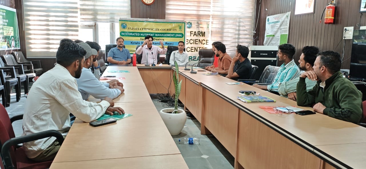 Early Times Report REASI, Oct 28: In continuation of 15 days certificate course on Integrated Nutrient Management (INM), Krishi Vigyan Kendra (KVK), Reasi under the aegis of Sher-e-Kashmir University of Agricultural Sciences and Technologies of Jammu (SKUAST-J) organized training programme on 'Integrated Nutrient Management' here today at KVK Reasi campus which was attended by a number of Krishi Udyamis of Kisan Khidmat Ghars(KKGs) and fertlizers dealers from different blocks of both Udhampur and Reasi distts. of J&K. The programme was organised under the dynamic leadership of Vice Chancellor of SKUAST-J, Prof. B.N. Tripathi and able guidance of Director Extension, Prof.Amrish Vaid of SKUAST-J. Various technical sessions were arranged during the programme. Dr. Banarsi Lal, Chief Scientist & Head of KVK, Reasi Scientist guided the participants on balanced use of fertilizers and manures. He discussed on the technique of soil sampling and urged the trainees to get their soils tested for the application of balanced use of fertilizers/manures. He also spoke in detail on soil health management. Dr. S.K. Singh, Professor, SKUAST-J virtually guided the trainees on the various kinds of biofertilizers, their composition and significance.He elaborated the benefits of natural and organic farming and guided participants on the formulation and use use of various bioagents. Dr.Arvinder Kumar spoke on the integrated nutrients management in various crops and highlighted the importance of balanced use of fertilizers for raising the rural economy. During the programme video show in INM and exhibition were arranged for the participants. The participants asked various quarries which were answered by the experts in a satisfactorily way. The programme was assisted by Manohar Lal and Sahil Kanathia and concluded by Dr. Banarsi Lal with the formal vote of thanks. |