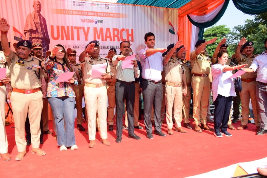 JAMMU, Oct 31: To commemorate the 150th birth anniversary of Sardar Vallabhbhai Patel, the Iron Man of India, Sardar @ 150 Unity March, a district-level Padyatra was organised today here from Gulshan Ground. The march was flagged off by Divisional Commissioner Ramesh Kumar in the presence of IGP Bhim Sen Tuti, Deputy Commissioner Jammu Dr Rakesh Minhas, DIG Shiv Kumar and ADC Ansuya Jamwal. Director Mera Yuva Bharat, Jammu & Kashmir and Ladakh Nisar Ahmed Butt was also present on the occasion. The march passed through Gujjar Nagar Bridge and culminated at Hari Singh Park. Bands from the J&K Police and BSF along with NCC cadets, NSS volunteers, school students and officers and staff of the district administration participated in large numbers and pledged to uphold the unity and sovereignty of the nation. Patriotic performances were presented by school students and artists from the Academy of Art, Culture and Languages. Tableaus were also showcased as part of the Unity Run. |