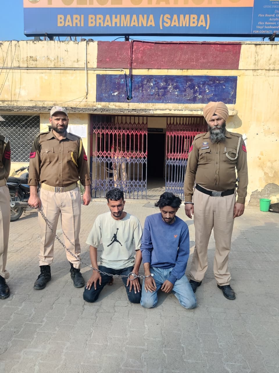 Samba, Nov 2: Continuing its drive against drug smugglers & peddlers, Samba Police has arrested two drug peddlers in the jurisdiction of Police Station Bari Brahmana and recovered 5.62 grams heroin like substance from their possession. A Police team of Police Station Bari Brahmana, during patrolling near JDA Park opposite Pillar No. 42 NHW, intercepted a motorcycle bearing registration No. JK02DP-5217 for checking which was coming from Sarore Adda side. During frisking, approximately 5.62 grams heroin like substance was recovered from the possession of motorcyclist and pillion rider. The drug peddlers identified as Munish Kumar S/o Rakesh Kumar and Aslam Choudhary S/o Siraj Din both R/o Channi Rama district Jammu have been arrested and the contraband item has been seized. The motorcycle has also been seized by the Police in the instant case. A case FIR No. 180/2025 U/S 8/21/22/25/29 NDPS Act has been registered at PS Bari Brahmana and investigation started.