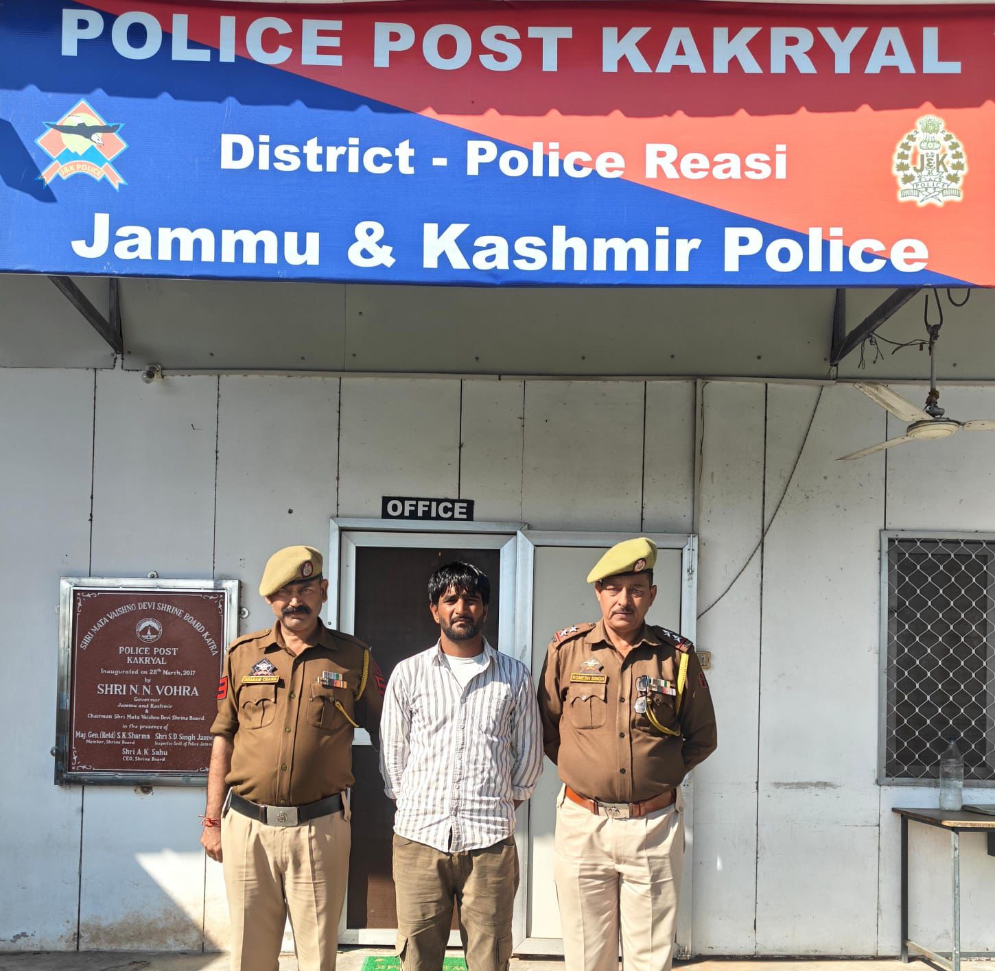Reasi, Nov 8: In a major breakthrough, Reasi Police today arrested a wanted absconder who had been evading arrest for the last two years. The accused has been identified as Mohd Razak S/O Shahid Ali R/O Badsoo, Tehsil Dansal, Jammu, who was wanted in FIR No. 01/2024 U/S 307/188 IPC, 11 PCA Act & 3/5 PDPP Act. The arrest was made by the alert police team of Police Post Kakryal, following sustained efforts and dedicated tracking to ensure that the accused was brought to justice. Further investigation in the case is in progress. The whole operation was conducted under the leadership of SHO Katra Insp Ranjeet Singh Rao, under the supervision of SDPO Katra Dr Bhishm Dubey, and SP Katra Vipan Chandran. SSP Reasi Paramvir Singh reiterates that Reasi Police is continuously intensifying efforts to trace and arrest absconders, criminals on the run and other fugitives to maintain law and order and ensure speedy justice.