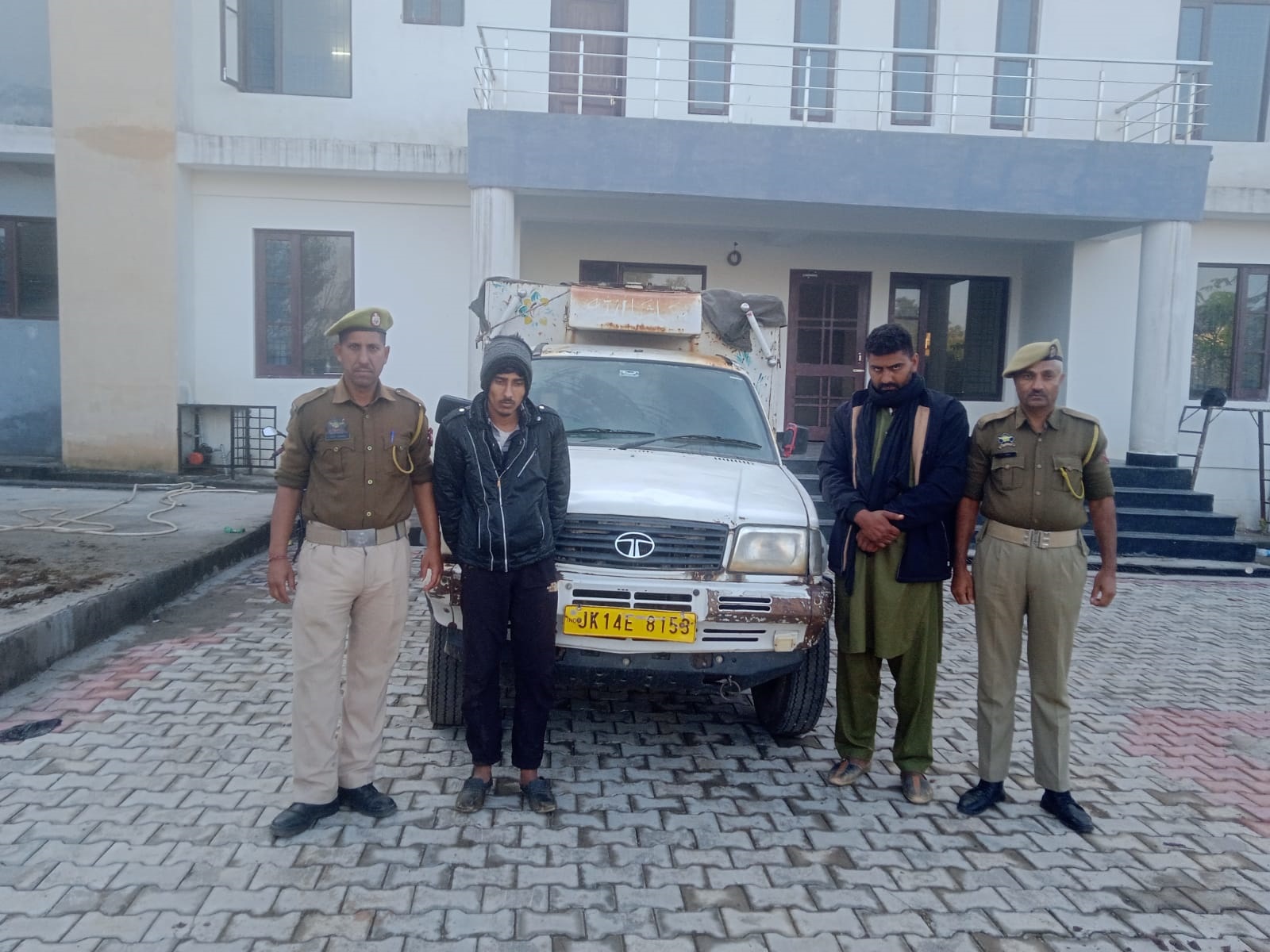 Udhampur, Nov 8: Continuing its intensified drive against bovine smuggling, Udhampur Police rescued 16 bovine animals in two separate incidents and seized both vehicles used in the crime. Case 1: Acting on a reliable input, Police Party of Police Post Jaganoo under PS Udhampur established a naka near Tawi Bridge, Jaganoo, and intercepted a Tata Yodha vehicle (JK14E-8153) coming from Dhalphar side. During checking, 06 bovine animals tied cruelly and being transported illegally towards Ramban/Srinagar were rescued. The accused driver Rahim Ali S/o Jamal Din and co-driver Mohd Gani S/o Noor Mohd, both residents of Tharad, Udhampur, were arrested. In this regards a Case under relevant sections of law stands registered at PS Udhampur. Case 2: During naka checking at NHW Kud, Police Party of PS Kud intercepted a Tata Pickup (JK02CJ-9608) coming from Chenani side. The driver fled from the spot, leaving behind the vehicle loaded with 10 bovine animals tied cruelly and being transported without valid permission. In this regard, Case FIR No. 43/2025 U/S 223 BNS, 11 PCA Act has been registered at PS Kud and investigation is in progress.