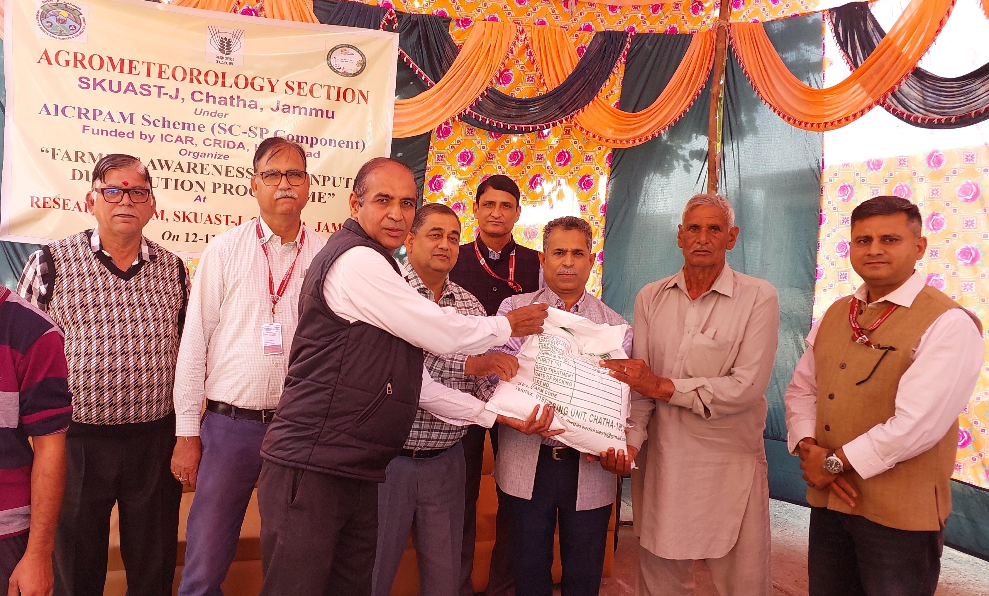 Jammu, Nov 12: Agrometeorology Section, SKUAST-J under the aegis of Dr. B.N.Tripathi, Honˈble Vice Chancellor and guidance of Prof. S.K. Gupta, Director Research, SKUAST-Jammu organized one day “Farmer awareness cum wheat distribution programme” at Research Farm, SKUAST-J, Chatha on 12th November, 2025. Prof. S.K. Gupta, Director Research, SKUAST-Jammu was the Chief Guest on the occasion. In this programme the total 225 farmers (male and female) participated. The main objective of this programme was to aware farmers community about the climate changes and its impact on rabi season crops and to improve the socio-economic status of the economically weaker section specially SC & ST by distribute the high yielding wheat seed (var. DBW-187). The programme was preceded by Dr. Mahender Singh, Chief Scientist and Incharge AICRPAM, who welcomed the gathering and discussed about weather based farm operation in rabi season crops and also brief to develop human resources through specifically providing adequate agricultural education about the climate and weather to the farmers. He encouraged the farmers to take more and more benefits participation in such type of programmes. Prof. S.K. Gupta, Director Research, Chief Guest, highlighted the various activities undertaken by the University for the Welfare of the farmer’s community for boosting their income from various agricultural enterprises. He stressed the farmer community to come forward regarding their agricultural related problems. He emphasized farmers to take maximum benefit of weather based agro-advisory services rendered by Agrometeorology Section, SKUAST – Jammu. Dr. Amrish Vaid, Director Extension, Guest of Honour, informed the farmers about the latest technological advancements, improved cultivation techniques and government initiatives taken for sustainable and profitable farming. Dr. Bodu Ram Bazaya, Chief Scientist Weed Management explained the farmers about effective weed management in different rabi crops without harssening the quality of soil and crops. He emphasized the farmers for applying optimum dose and timely application of weedicide for getting maximum benefits to achieve economic and ecological goals with the least efforts. Dr. Tuhina Dey, Prof. and Head, Division of Plant Breeding apprised about the benefits of distributed Wheat variety viz., DBW-187 (a popular timely sown irrigated wheat variety) which have good yield potential 50-60 q/ha. He further made aware farmers about latest high yielding varieties released by SKUAST-Jammu as well as focused on cultivation of climate and disease resistant varieties of rabi season crops. Dr. Vijay Bahadur, Chief Scientist, Plant Pathology briefed the farmers regarding management of insects/pests causing huge damages to Agriculture and Horticulture crops. He also explained farmers various location specific integrated/composite farming systems to enhance agriculture productivity that makes farm sector more productive, sustainable, remunerative and climate resilient. Dr. Rohit Sharma, Technical Officer (Agromet), AMFU, Rajouri highlighted the importance of Agromet Advisory services in day today agriculture activities. He motivated the farmers to make maximum use of Meghdoot, Mausam and Damini mobile apps for timely and effective use of AABs. Mr. Dharamvir, AO, Shesh Narayan Kumwat, Ph.D. Scholar and Romika,M.Sc student of Agrometeorology Section also participated in the programme. Janak Raj and Harvinder also help to organize the event. Dr. Charu Sharma, YP-II, AICRPAM-NICRA Project presented the vote of thanks and appreciated the woman farmers for their participation.