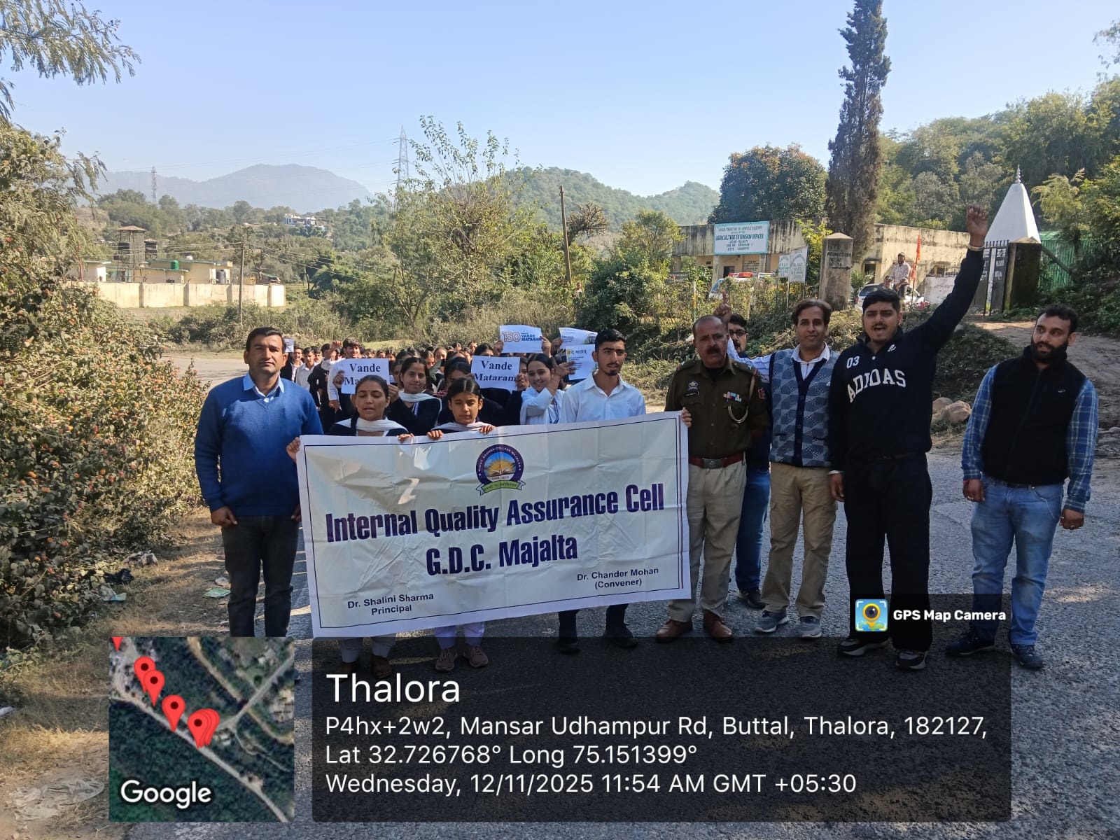 Majalta, Nov 12: Government Degree College Majalta organized a vibrant Youth Rally at Battal Chowk to commemorate 150 years of the patriotic song ‘Vande Mataram’, celebrating its historical and cultural significance in India’s freedom movement. The event was organized by Dr. Chander Mohan Convener IQAC and Dr. Dalip Kumar HOD EVS, coordinated by Prof. Naresh Kumar, under the guidance of the esteemed Principal, Prof. (Dr.) Shalini Sharma. Around 120 enthusiastic students from the college actively participated in the rally, raising slogans and carrying banners that reflected the spirit of patriotism and national pride. The rally aimed to instill a sense of unity, respect for the nation, and awareness among the youth about the legacy of ‘Vande Mataram’. Among the faculty members Prof. Kamal Jeet, Dr. Baljeet Kour, Dr. Sunil Singh and Dr. Mohd Abass Wani also accompanied and guided the students throughout the rally, ensuring its smooth and meaningful conduct. Speaking on the occasion, Prof. (Dr.) Shalini Sharma appreciated the efforts of the organizing team and the active participation of students. She emphasized that such events play a vital role in reconnecting today’s youth with India’s glorious past and cultural heritage. The event concluded with a vote of thanks to all participants and contributors who made the rally a grand success.