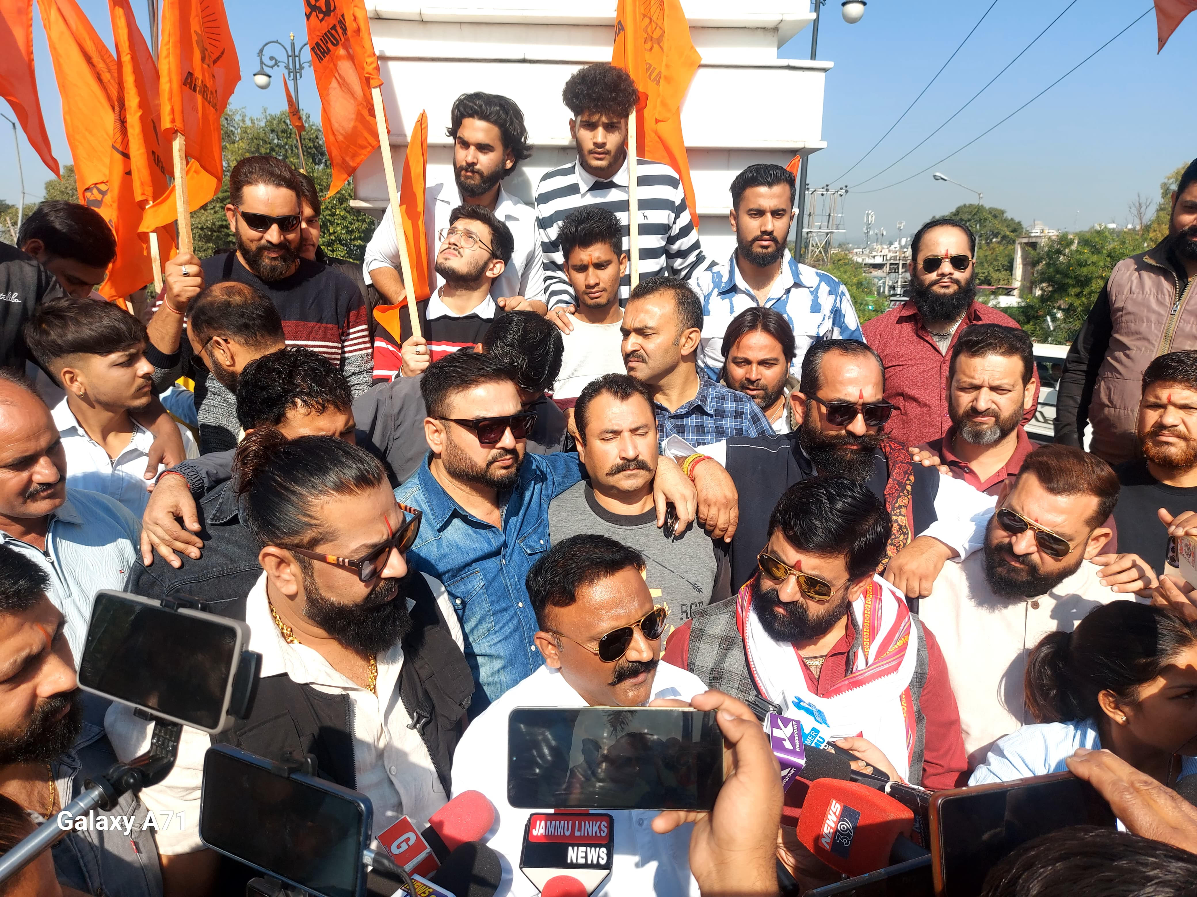 Jammu, Nov 13: A massive and strong protest demonstration was today organized by Yuva Rajput Sabha (YRS) at Tawi Bridge near Maharaja Hari Singh Statue, where hundreds of youth gathered to raise their voice against the blatantly discriminatory selection process of MBBS candidates in Shri Mata Vaishno Devi University (SMVDU) and the one-sided and vindictive action taken against SDPO Gandhi Nagar, Sh. Sunil Jasrotia. Addressing the charged gathering, Sanjeev Singh Rinku, President YRS , came down heavily on the university authorities for their Anti-Hindu and biased approach in the MBBS selection list, where Hindu candidates were given almost negligible representation, despite the fact that SMVDU is a temple of education built and maintained with donations and offerings from Hindu devotees from across the nation. He demanded immediate review and correction of the selection list, and warned that such selective victimization of Hindu youth will not be tolerated any longer. Former Presidents Vikram Singh Vicky , Rajan Singh Happy and Surinder Singh Gilli also addressed the protest, condemning the discriminatory and politically motivated action against SDPO Gandhi Nagar, Sh. Sunil Jasrotia, who is being deliberately targeted, while J&KAS Officer Azhar Khan, who had manhandled the matador driver and the wireless operator of SDPO Gandhi Nagar, continues to roam free without any punishment or departmental action. They said this blatant double standard exposes the bias within the system, and demanded that strict disciplinary proceedings be initiated against Azhar Khan without any delay. Prominent YRS leaders including Adv. Pushvinder Singh, Mohinder Singh, Ramesh Singh, Shamsher Singh, and Rajinder Singh (Core Committee Members) and other active members were also present and actively participated in the protest, declaring full support to the cause. The Sabha members warned the administration that if justice is not delivered immediately, and if the discrimination against Hindu candidates and selective targeting of honest officers continues, YRS will intensify its agitation across Jammu region, and the government alone will be responsible for the consequences. The YRS reaffirmed that it will continue to fight fearlessly for justice, equality, and dignity of the people of Jammu region, and will not remain silent spectators to any form of injustice or bias.