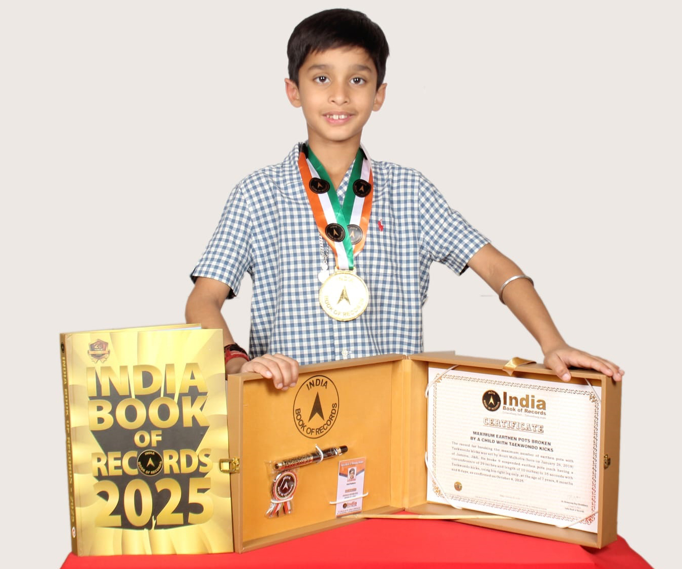 Early Times Report JAMMU, Nov 13: Avnit Malhotra age 7 years old son of Vinit Malhotra and Dr. Charu Malhotra of Jodhamal Public School has made record of breaking maximum earthen pots of each having circumference of 29 inches and length of 10 inches in 35 seconds with Taekwondo kicks, using his right leg for India’s most prestigious record India Book of Records as confirmed on October 4th 2025. Under the guidance of his coach Pawan Kumar he has proven to break his own barriers as this record is one of the rarest and has never been attempted by anyone. Avnit has already made 2 world record for International Book of Records and has won many gold medals in Karate state and national championship. Avnit record is also featured on national television news channel India news. Avnit hardwork, zeal, determination towards his passion for sports be it Karate, Football has been inspiration for many. This achievement is expected to serve as a source of inspiration for him to pursue even greater goals in life. |
