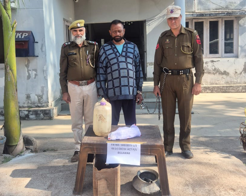 | Police tightens noose on illicit liquor trade | | | Early Times Report KATHUA, Nov 15: In continuation to stringent actions against illicit liquor menace, J&K Police Kathua under the overall supervision of SSP Kathua Ms. Mohita Sharma -IPS cracked down on illicit liquor, conducted a series of raids at Kishanpur area of PS Billawar, destroyed approx. 600 litres of Lahan, seized 10 litres illicit liquor as well equipments used for making illicit liquor (Desi) and one person arrested on spot. On 15/11/2025, police team led by SHO PS Billawar Insp. Zaheer Mushtaq under the close supervision of SDPO Billawar Sh. Neeraj Padyar JKPS raided at Kishanpur as well as its adjoining area of P/S Billawar. During checking the police team was able to recover approx. 600 litres Lahan and seized 10 Litres of Illicit liquor(Desi) and one person arrested in this connection.Thereafter the said team destroyed approx. 600 litres of lahan as well as destroyed makeshift production units used for manufacturing of illicit liquor and seized 10 Ltrs. Illicit liquor(Desi) seized alongwith one person arrested on spot.In this regard a case FIR No. 169/2025 U/S 48 Excise Act stands registered at PS Billawar and further investigation is underway. SSP Kathua Ms. Mohita Sharma IPS said that strong steps are being taken to contain drug and liquor menace in the district. She further said that such raids will be conducted in other identified areas where such illegal activities are going on. The SSP Kathua also warned all those who are indulging in illicit liquor trade saying, strict action under law will be taken against them. She also appealed to people of the area to come forward and share information about any such illegal activities with Police by dialing 100 or 9858034100. |