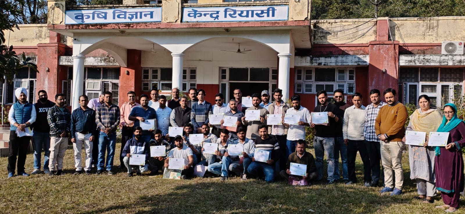 | KVK Reasi Trains Krishi Udyamis of KKGs, Input Dealers on INM | | |  early times report Reasi, Nov 16: Krishi Vigyan Kendra (KVK), Reasi under the aegis of Sher-e-Kashmir University of Agricultural Sciences and Technologies of Jammu (SKUAST-J) concluded 15 days certificate course on Integrated Nutrient Management (INM) here at KVK Reasi campus which was attended by a number of Krishi Udyamis of Kisan Khidmat Ghars(KKGs) and input dealers from different areas of both Reasi and Udhampur distts. of J&K. The programme was organised under the dynamic stewardship of Hon’ble Vice Chancellor, Prof.B.N.Tripathi and able guidance of Director Extension, Prof.Amrish Vaid of SKUAST-J. Prof.Amrish Vaid,Director Extension of SKUAST-J was the Chief Guest during the valedictory session. He suggested the participants to take advantage of such type of useful training courses and assured every possible support from the Directorate of Extension.He stressed on the balanced application of essential nutrients in plants and discussed on the Integrated Nutrient Management. He also guided participants on Integrated Farming System and emphasized on rural youth and women empowerment. He highlighted the marketing, branding and packaging of agro-inputs for more farm returns.He appreciated the efforts of KVK Reasi for organising the useful certificate course and encouraged KVK scientists for the welfare of the farming community. Earlier Dr.Banarsi Lal, Chief Scientist & Head of KVK Reasi Scientist warmly welcomed the Chief Guest and apprised him about the details the activities in the course. He said that the trained persons can act as the extension agents in their respective areas who further can guide the farmers of their areas on the efficient use of organic and inorganic fertilizers.Sh.Rajinder Sharma, Chief Horticulture Officer, Reasi said that the Krishi Udyamis and input dealers should extend their knowledge to their fallow farmers so that their knowledge on balanced doses of fertilizers/manures can be upgraded. He guided the participants on different horticultural schemes undergoing in the distt. DDM NABARD, Reasi, Sh.Adarsh Gupta spoke on the banking literacy and also on the entrepreneurship development in agriculture. Dr.Vijay Sharma, Deputy Director Extension, SKUAST-J also spoke during the programme and upgraded the knowledge of the participants. Dr.Rohit Kumar, Department of Animal Husbandry,Reasi spoke on different schemes for the dairy farmers. Sh.Kamal Singh, Naib Sarpanch of the area thanked KVK Reasi for organizing such a useful programme. Special field visits and exposure visits at organic and natural farmers’ fields were also arranged by the KVK Reasi. Dr.Mandeep Singh Azad, Dr.Sanjay Kaushal,Dr.Lalit Upadhyay,Dr.Arvinder Kumar, Dr.Jagdish Kumar, Sh. Manohar Lal,Sh.Rakesh Kundal,Sh.Mohd. Iqbal,Sh.Sahil Kanathia and Sh.Summer Qureshi were also present during the programme. Certificates were awarded to the participants by the Chief Guest during the programme. The programme was concluded by Dr.Mandeep Singh Azad, Scientist with formal vote of thanks. |
