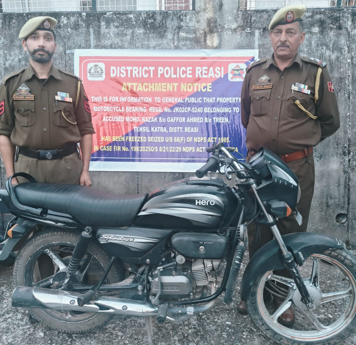 | Narco-finances hit: Reasi police attach vehicle bought from drug money | | | Early Times Report REASI, Nov 17: In continuation of its sustained drive against drug peddlers and in a determined effort to dismantle the illicit narcotics network, District Police Reasi today attached illegally acquired property belonging to a notorious drug peddler. A motorcycle bearing registration number JK02CP-5240, owned by accused Mohd Razak S/O Gafoor Ahmed R/O Treen, Tehsil Katra, District Reasi, has been attached under Section 68-F of the NDPS Act, 1985. The action follows a thorough financial investigation conducted by Police Station Katra during the course of FIR No. 198/2025 U/S 8/21/22/29 NDPS Act, P/S Katra. The enquiry established that the said vehicle was purchased from the proceeds of illicit trafficking of narcotic drugs and psychotropic substances, qualifying it as an illegally acquired asset under NDPS provisions. The attachment marks another significant step in the ongoing crackdown on drug traffickers. District Police Reasi remains committed to acting firmly against offenders by not only arresting those involved in the supply chain but also targeting and seizing properties raised through illegal drug money. The general public has widely appreciated this decisive action, praising the strong stance of Reasi Police in curbing the drug menace and in choking the financial gains of offenders involved in narcotics trafficking. The entire operation was carried out by SHO P/S Insp. Ranjeet Singh Rao, under the close supervision of SDPO Katra Dr. Bhishm Dubey, JKPS and SP Katra Vipan Chandran, JKPS. SSP Reasi Paramvir Singh, JKPS reiterates its resolve to continue its relentless efforts against drug trafficking to safeguard the youth and maintain peace and security in the district. |