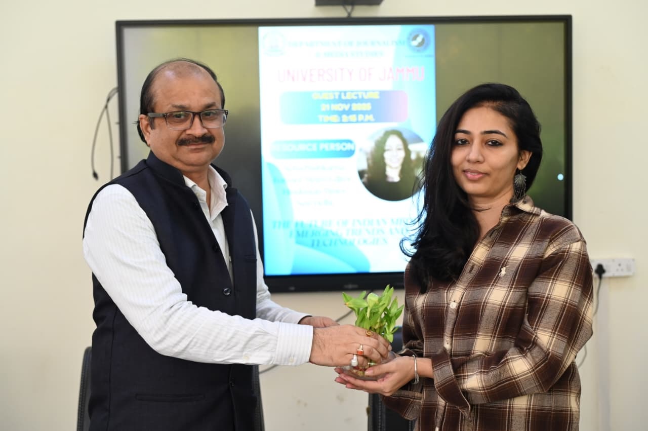 Jammu, Nov 21 : The Department of Journalism and Media Studies, University of Jammu, organised an insightful guest lecture on the topic “The Future of Indian Media: Emerging Trends and Technologies”. Here today the session featured Neha Pushkarna, Former Metro Editor, Hindustan Times, New Delhi, as the resource person. The programme was held under the guidance of HoD Prof. Garima Gupta and Prof. Dushyant Kumar Rai. The event saw an active participation of faculty members Dr. Kumerjeet Chajgotra, Dr. Ravia Gupta, Dr. Ramyan Bharadwaj and Dr. Pardeep Bali along with an enthusiastic group of media students. The session began with a warm welcome address by Prof. Dushyant Kumar Rai. He appreciated Neha Pushkarna’s willingness to share her rich experience of over two decades in the field of journalism with the media students. Dr. Ravia Gupta formally introduced the guest, highlighting her illustrious career with leading publications such as The Times of India and Hindustan Times, and her expertise in news writing, new media, blogging, business journalism, and content development. Delivering the lecture, Neha Pushkarna captivated the audience by discussing the evolving landscape of Indian media, relevance of print alongside digital platforms, and the transformative impact of emerging technologies. She laid special emphasis on timeless journalistic skills strong writing, unwavering passion, neutrality, fact-verification, and ethical storytelling that remain crucial irrespective of the medium. She also guided students on adapting to new tools and trends while preserving the core values of the profession. The lecture was followed by an engaging interactive session where students enthusiastically raised questions on the challenges and opportunities in digital journalism, the future of newsrooms, and the role of artificial intelligence and social media in shaping public discourse. The session received an overwhelmingly positive response from the students, who described it as both inspiring and practically enriching. Students noted that the real-world insights shared by the resource person helped in bridging theoretical learning with industry realities and motivated them to hone their skills with greater purpose and responsibility. The programme concluded with a formal vote of thanks proposed by Dr. Pardeep Bali. Dr. Kumerjeet Chajgotra conducted the event.