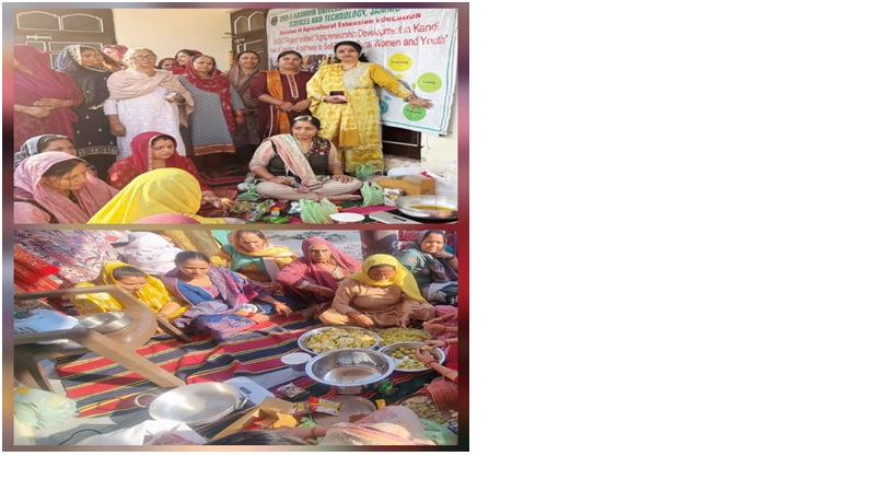 Jammu, Nov 21: Training Programme on Empowering Farm Women & Rural Youth: Kandi’s Path to food Security and Stable Incomes was organized by the Division of Agricultural Extension Education, SKUAST-Jammu (sponsored by JKST&IC project) for the Rural Women & Youths of village Maira Mandrian, block Akhnoor of District Jammu under the noble guidance & dynamic leadership of Hon’ble Vice Chancellor, Prof. B.N. Tripathi. Professor P.S. Slathia (Co-PI of the JKST&IC project), Division of Agricultural Extension Education, Prof Poonam Parihar (PI of the JKST&IC project), Division of Agricultural Extension Education, KVK Kathua, Dr. Neerja Sharma (Co-PI of the JKST&IC project) & Chief Scientist, Horticulture, KVK Samba attended & participated in the Programme. While giving the welcoming address, Prof P.S. Slathia highlighted that how Value Addition ensues food availability during off-season, provides stable income streams for farmers and reduces vulnerability to crop damage by wild animals. Agripreneurship has potential to generate growth, diversifying income, providing widespread employment and entrepreneurial opportunities in rural areas and the minor fruits with their diverse characteristics and untapped potential, offer significant opportunities for value addition and entrepreneurship which enhances farmers' incomes by leveraging their unique qualities, nutritional benefits, and cultural significance. There is a vast production of underutilized and underexploited minor horticultural crops which could be used as the “future crops” to supplement our nutritional needs. The producers, sellers and workers involved in minor fruit production, packaging and selling may improve their livelihoods from this sector. Professor Poonam Parihar, Principal Investigator of the Project deliberated upon the value addition of minor fruits which can substantially uplift rural livelihoods by creating a range of economic and social benefits. Since the rural Kandi Area in Jammu is dominated by traditional and minor fruits like Desi mango, Gal gal, Chakotra, Jhamiri, Khatta, Kimb, Ber, Aonla, Jamun, Karonda, Phalsa & Bael etc. She focussed on processing local fruits like Aonla (Indian Gooseberry), Karonda (Carandus Plum), Bael (Wood Apple), Ber (Jujube), Galgal (Hill Lemon), & Lasora (Gum Berry), into juices, jams, candies, preserves, pickles and therapeutic powders. The target group (Women and youth) could be exposed to different training interventions for increasing their knowledge & Skill up gradation. The demonstrations/training on post-harvest operations like grading, Packaging Branding & Marketing would encourage self-employment to rural people and value addition of locally available minor fruits. It will improve the productive efficiency of the natural resources and provide better and more livelihoods options to farmers and agriculture workers. Agripreneurship has the potential to contribute to a range of social & economic development such as employment generation, income generation, poverty reduction & improvements in nutrition, health & overall food security in the National economy. Aripreneurship has potential to generate growth, diversifying income, providing widespread employment and entrepreneurial opportunities in rural areas and the minor fruits with their diverse characteristics and untapped potential, offer significant opportunities for value addition and entrepreneurship which enhances farmers' incomes by leveraging their unique qualities, nutritional benefits, and cultural significance. Dr Neerja Sharma, Chief Scientist, Horticulture, KVK, Samba briefed the participants about the importance of value addition, industrial growth, urbanization & globalization. She also apprised the participants about the Formulation of farmers Interest Groups for market-led-extension can uplift the socioeconomic conditions of the target group. Traditional and minor fruits contribute to poverty reduction and livelihood enhancement as well as ensure household food and nutritional security adding women and youth participation through employment and income generation. The producers, sellers and workers involved in minor fruit production, packaging and selling may improve their livelihoods from this sector. She along with the team members laid Scientific practical demonstrations on Value addition of Aonla pickle & Candies and Galgal pickle which was distributed among the participants and relished by them. The Programme was attended by Mr.Mukesh, Kumar, Artist cum photographer, Mrs Sangeets Gourey, Project Assisstant, PG & Ph.D students of SKUAST-Jammu. The programme was concluded with a vote of thanks by Smt. Anita, the group Coordinator. Village Maira Mandrian, Block Akhnoor, District Jammu.