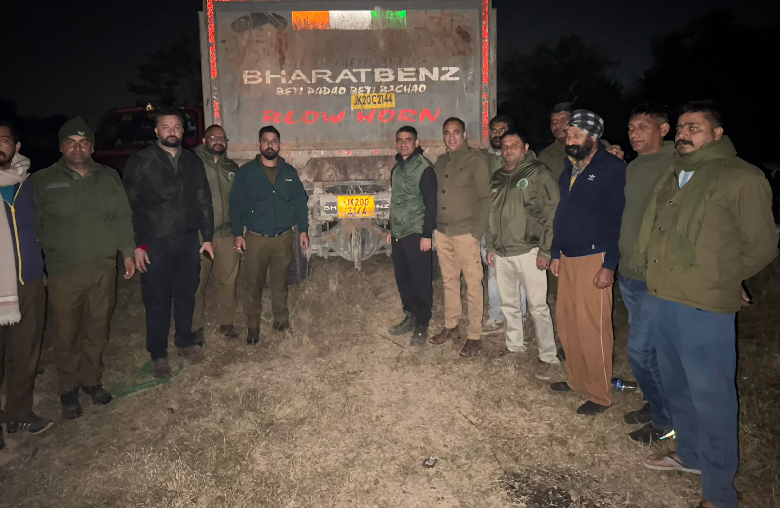 Early Times Report JAMMU, Nov 22: In a major crackdown on illegal timber smuggling, officials of the Jammu Forest Range, in coordination with Police Station Gharota, intercepted and seized a Bharat Benz dumper carrying illegally sourced Khairwood billets on Thursday. The vehicle, bearing registration number JK20C-2144, was reportedly transporting a large quantity of the high-value timber without valid permits. The operation was carried out under the direct supervision of Divisional Forest Officer Jammu, Shri Anurag Arya, IFS, following actionable intelligence inputs regarding the movement of the vehicle. A team led by Range Forest Officer Jammu, Shri Kailash Choudhary, carried out the interception. The operation also included Shri Vikram Singh (Block Officer Manawar), Shri Sugam Bral (Block Officer Paloura), Shri Rakeshwar Singh (Block Officer Nagrota-I) and other frontline forest staff. Officials confirmed that confiscation proceedings have been initiated under the relevant provisions of the Indian Forest Act. The seized dumper and timber have been taken into custody pending further legal action. Forest officials stated that the seizure is part of an ongoing campaign to curb timber smuggling and illegal forest activity in the region. Khairwood, commonly used in katha extraction, commands a high market price, making it a frequent target for illegal trade. Authorities have appealed to the public to report suspicious activities involving forest produce or timber movement to help prevent further damage to forest resources. |