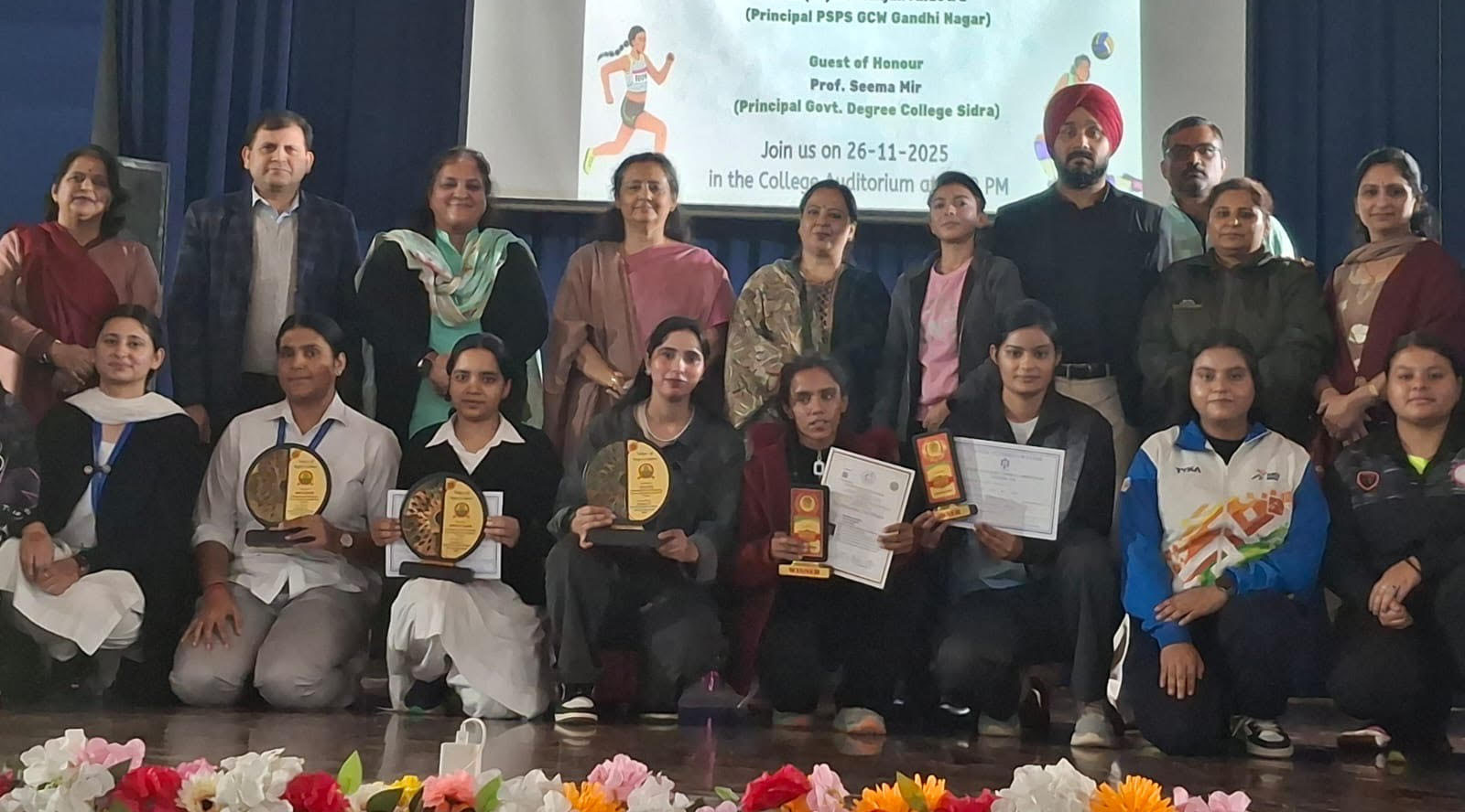 Early Times Report JAMMU, Nov 26: PSPS Government College for Women, Gandhi Nagar, Jammu celebrated its Annual Sports Day 2025 on 26th November 2026 with great enthusiasm and vibrant participation. The event was organized by the Sports Committee and the Department of Physical Education & Sports in collaboration with the J&K Bank Gandhi Nagar Jammu. Prof. (Dr.) Geetanjali Andotra, Principal of the College, graced the occasion as the Chief Guest, while Prof. (Dr.) Seema Mir, Principal, GDC Sidhra, attended as the Guest of Honour. Dr. Shradha Anand, Convener, Sports Committee, formally welcomed the dignitaries. In her address, the Principal emphasized the significance of sports in cultivating discipline, teamwork, leadership, and healthy competition among students. She encouraged the participants to uphold the spirit of sportsmanship and continue striving for excellence both on and off the field. The celebration featured a series of athletic events, cultural performances, and demonstrations, reflecting the college's strong commitment to holistic development. During the ceremony, the Sports Report for the session 2024-25 was presented, showcasing exceptional achievements. A total of 120 students participated across 17 Inter-Collegiate sports events. The college secured 8 trophies, 1 Runner-Up position, 6 Gold medals, and 1 Silver medal. Outstanding performances were recorded in Fencing, Basketball, Kabaddi, Volleyball, Kho-Kho, Handball, Netball, Yoga, Pencak Silat, and Wushu. The institution proudly acknowledged five International medalists-Nazia Bibi (Kho-Kho World Cup Winner), Aneesha Sharma (International Shooter, 3rd in All India Ranking), Akriti Sharma (Thang Ta National Medalist), Jiya Choudhary (Pencak Silat National Medalist), and Taniya (Netball National Medalist)-along with five National players: Shimani Choudhary (Shooting), Shamshad (Kho-Kho), Shazia Qureshi (Volleyball), Tania (Kabaddi), and Kiran Katoch (Kabaddi). Additionally, 22 students represented the college as Inter-University participants across various disciplines. The Sports Day 2025 results included competitive events such as Volleyball, Badminton, Tug of War, Athletics, Carrom, and various fun races, with students displaying exceptional enthusiasm, discipline, and sportsmanship. The event was successfully organized with the active participation and valuable contributions of the Sports Committee members. It concluded with a felicitation ceremony celebrating the achievements and efforts of the participating athletes, reaffirming the college's commitment to promoting excellence in sports. A formal Vote of Thanks was presented by Dr. Vijender Kumar, who expressed gratitude to all dignitaries, participants, and contributors for making the event a grand success. |