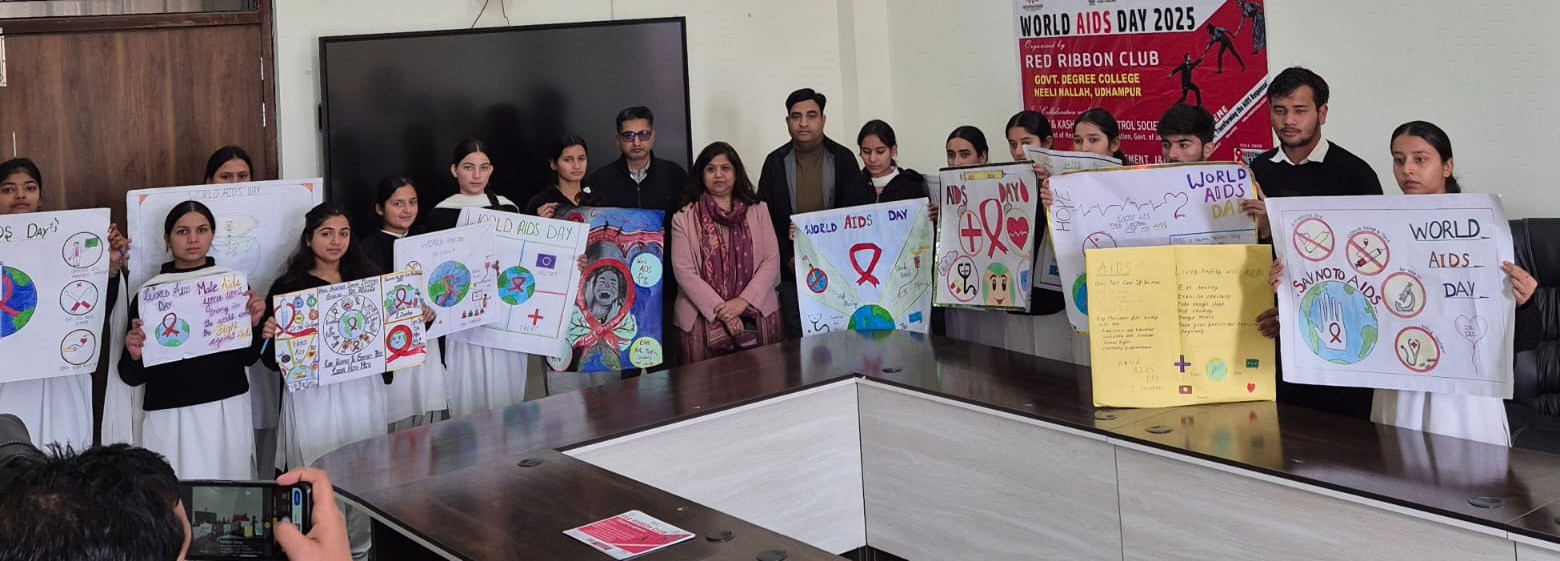 Early Times Report UDHAMPUR, Dec 18: Red Ribbon Club, GDC Neeli Nallah Udhampur organized multifarious activities regarding the celebration of World AIDS Day. The activities were conducted under the esteemed guidance of the Principal of the College, Prof. (Dr.) Seema Arora. The event commenced with poster making competition on 15th of December 2025 which brought together students from various semesters, offering them a creative platform to express awareness, empathy and responsibility around HIV/AIDS. The competition witnessed enthusiastic participation, with students using colours, symbols and strong messages to highlight prevention, stigma reduction and the importance of informed choices. Each poster reflected not only artistic skill but also a clear understanding of the social and health-related dimensions of HIV/AIDS. About 14 students participated in the competition showcasing their posters depicting awareness about HIV/AIDS, the importance of prevention and early testing, the need to eliminate stigma and discrimination, and the message of compassion and support for people living with HIV/AIDS. Sharuti Sharma, Sharuti Anthal and Mehak of Semester 1st, secured 1st, 2nd and 3rd position respectively. On 16th of December 2025, an awareness lecture was delivered by Dr. Sunil Tanoch, Convenor Red Ribbon Club. He said that Awareness, prevention, and compassion are the most effective tools in the fight against HIV/AIDS. A rally was also flagged off from the college premises on 18th of December 2025, that aimed to educate the public on the causes, prevention, and treatment of HIV/AIDS, while encouraging compassion and support for those affected. Participants carried placards and banners displaying awareness messages and slogans emphasizing safe practices and social responsibility. Speaking on the occasion, the Principal highlighted that such initiatives not only spread awareness but also nurture empathy, responsibility and informed thinking among our youth. She further appreciated the students for their sincere efforts and emphasized the relevance of youth involvement in spreading correct information and compassionate attitudes towards people living with HIV/AIDS. All participants were felicitated with certificate of appreciation. Others present were Prof. Rekha Sharma, Prof. Shaista Yasmeen, Dr. Akhter Hussain, Dr. Nishi Slathia, Dr. Bilal Ahmad Beigh, Dr. Aashiq Hussain and Dr. Arif Malik. |