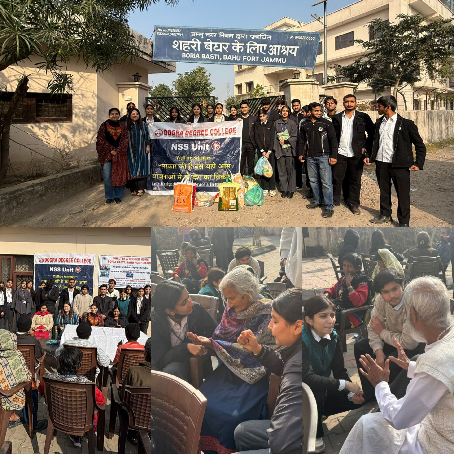 Jammu, Dec 26: The NSS Unit of Dogra Degree College organized a meaningful social outreach visit to Rain Basera – Shelter Home for Urban Homeless, situated at Bahu Fort, Jammu, on 24th December 2025 (Wednesday) at 10:00 a.m. under the guidance of Ms. Simran Thakur, NSS Programme Officer, Dogra Degree College.The initiative forms part of the college’s continued efforts to promote social awareness, compassion, and a spirit of service among students. The primary objective of the visit was to spread warmth, care, and joy among the homeless and marginalized sections of society, particularly during the harsh winter season. Through this humanitarian activity, NSS volunteers seek to extend support to the inmates of Rain Basera while also sensitizing students to the realities faced by the urban homeless. As part of this noble initiative, the students from Dogra Degree College have come forward with heartfelt contributions in the form of essential food items, including edible oil, milk, grains, and other basic necessities. These contributions have been voluntarily collected by the NSS unit, reflecting the collective concern and social commitment of the student community towards the needy. During the visit, NSS volunteers of Dogra Degree College interacted with the residents of the shelter home, offering not only material assistance but also emotional support and companionship. The programme was further supported by Ms. Rajni, Coordinator, whose guidance and cooperation added to the success of the visit. Such interactions aimed at fostering mutual understanding, empathy, and respect for human dignity. The activity also served as a practical learning experience for students, reinforcing values such as cooperation, kindness, and social responsibility. The NSS Unit of Dogra Degree College remains dedicated to organizing activities that contribute to social welfare and inspire students to actively participate in service to humanity. The outreach initiative was conducted under the patronage and visionary guidance of Dr. Samar Dev Charak, Secretary, Dogra Educational Trust, whose constant encouragement towards community engagement and social responsibility continues to inspire such humanitarian activities. The programme was organized under the able leadership of Dr. Bela Thakur, Principal, Dogra Degree College, who emphasized the importance of inculcating values of empathy, service, and civic responsibility among students through active participation in NSS activities.