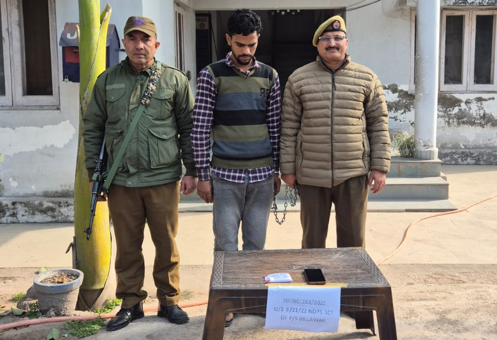 | Approx 3.40 grams heroin like narcotics recovered by P/S Billawar; 1 drug peddler arrested | | | Early Times Report KATHUA, Dec 26: Continuing its crackdown against drug peddlers, J&K Police Kathua under the overall supervision of SSP Kathua Ms. Mohita Sharma IPS recovered approx. 3.40 grams Heroine like narcotics in the jurisdictional area of PS Billawar and one drug peddler was arrested. On dated 25/12/2025 a Police team of P/S Billawar led by SHO Billawar Insp Zaheer Mushtaq under the supervision of SP Upper Kathua Sh Aamir Iqbal and SDPO Billawar Sh Neeraj Padyar established a special naka for checking of vehicles. During checking police team apprehended 01 person who later on disclosed his name as Bhushan Kumar S/o Des Raj R/o Dhanjasdhar Tehsil Ramkot District Kathua. During his personal search 3.40 grams of Heroine (chitta) like substance has been recovered from his possession. Thereafter all the recovered consignment of drugs (Approx. 3.40 Grams Heroin like Narcotics) got seized and one person arrested on spot. In this regard a case FIR No. 183/2025 U/S 8/21/22/NDPS Act stands registered at Police Station Billawar, further investigation is underway. |
