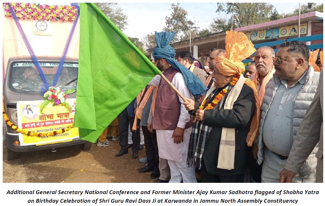 JAMMU, Jan 25: National Conference Additional General Secretary and former minister Mr Ajay Kumar Sadhotra on Sunday described the message of Sant Guru Ravidass Ji as more relevant than ever in the present times when society is confronted with multiple challenges, including growing hatred, intolerance and social divisions. Addressing a gathering after flagging off the Shobha Yatra organised by Guru Ravidass Sabha at Karwanda in the Jammu North Assembly constituency, Mr Sadhotra said the teachings of the great saint offer a timeless roadmap for building a humane, just and harmonious society. He said that at a time when values of mutual respect and coexistence are under strain, the spiritual wisdom of saints like Guru Ravidass Ji assumes renewed significance. Message of compassion, harmony are more relevant amid rising intolerance. Dwelling at length on the life and teachings of Guru Ravidas ji, the National Conference Addl General Secretary said the revered saint dedicated his life to the upliftment of humanity by preaching equality, love and social justice. He said Guru Ravidass Ji strongly opposed discrimination on the basis of caste, creed or social status and advocated a society founded on dignity and compassion for all. Mr Sadhotra said that the core message of all religions is essentially the same love for fellow human beings, compassion for the weak and harmony among communities. No religion preaches hatred or exclusion. The real essence of faith lies in uniting people and promoting peace, understanding and brotherhood,” he said. Highlighting the historical role of saints and sages, Mr Sadhotra said they have always acted as unifying forces in society, guiding people towards moral values and collective well-being. He said spiritual leaders across generations have inspired humanity to rise above narrow identities and work for the common good. “Saints and sages have consistently brought people together and helped societies overcome divisions,” he added. The former minister said that the National Conference has always stood for unity, brotherhood and an inclusive way of life, in line with the teachings of great saints andsages. He said the party believes in strengthening the bonds of social harmony and ensuring equal respect and opportunities for all sections of society. “Our political and social philosophy is rooted in the values of amity, mutual respect and inclusiveness,” he said. |