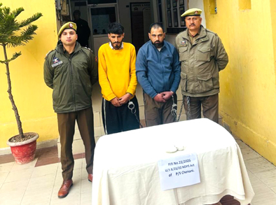 | Inter district drug module busted, 2 drug peddlers arrested | | | Early Times Report UDHAMPUR, Feb 9: Police team of Police Station Chenani while conducting naka checking duty at motor shed, Chenani intercepted one Baleno Car bearing registration number JK03P- 7083 coming from Jammu towards Srinagar for checking purpose. During checking, two persons were found sitting in the vehicle who on questioning disclosed their identities as: Gulzar Khan S/O Gulzar Ahmed Khan R/O Devipora, Anantnag (driver,13.10 grams) Abid Hussain Peer S/O Peer Siraj U Din R/O Kokernag, Anantnag (41.89 grams) During their personal search, 54.99 grams of Heroin were recovered from their possession. On being questioned about the recovered narcotic substance, both failed to give any satisfactory reply regarding its possession. In this regard, Case FIR No. 22/2026 under Sections 8/21/22 NDPS Act has been registered at PS Chennai and investigation of the case has been taken up. |