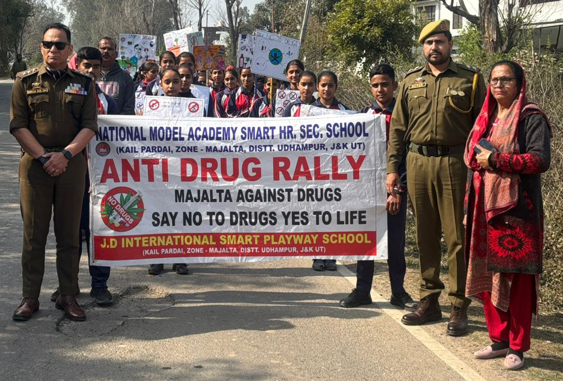 Early Times Report UDHAMPUR, Feb 26: Udhampur Police organized a Drug Awareness Programme at National Model Higher Secondary School, Dhamma Majalta, which was presided over by SDPO Ramnagar Mirza Sultan and SHO PS Majalta PSI Abdul Satar. During the programme, officers of Udhampur Police interacted with the students and staff, spreading awareness about the harmful effects of drug abuse and sensitizing them about NCL, while reinforcing the message of a drug-free society under the theme "Say No to Drugs." A rally under the banner "Drug-Free Majalta" was also taken out by students and staff members in the presence of police officers, demonstrating collective resolve against substance abuse. |