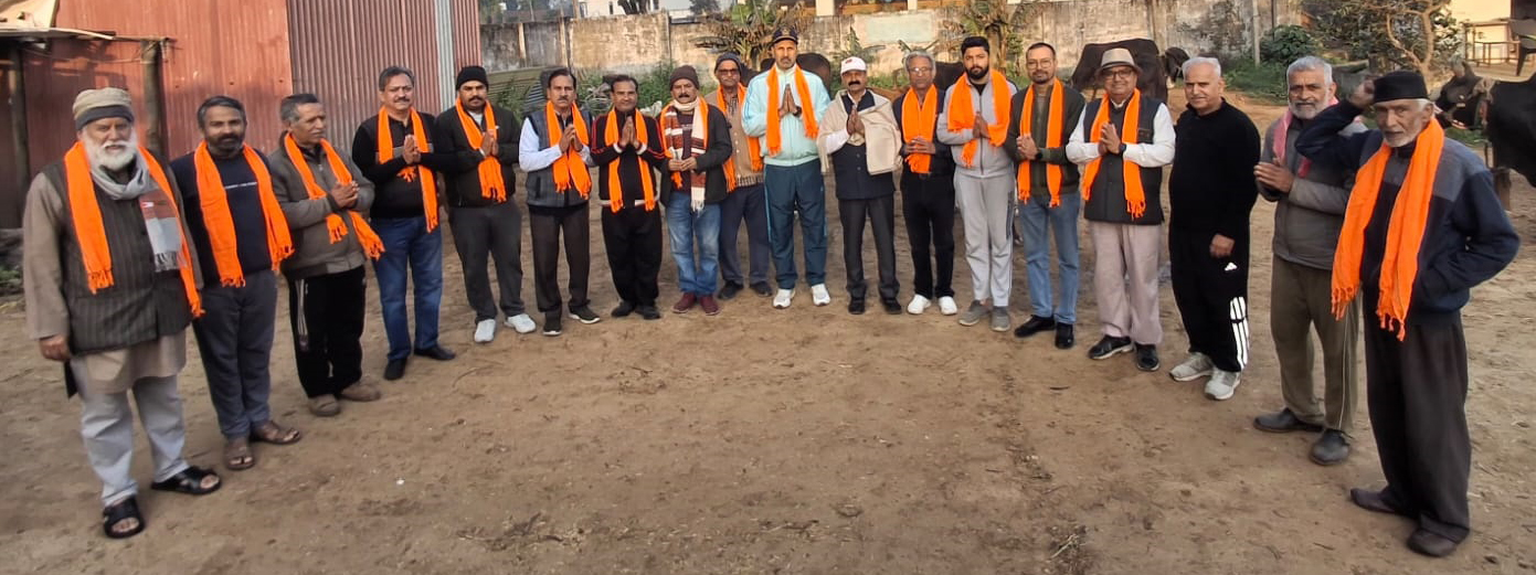 Early Times Report JAMMU, Feb 28: On the occasion of Ekadashi, a group of Gau Sevaks travelled to Shridhara Gaushala, Lower Gadigarh, today early morning and served eatables to the cows and bulls kept in the Gaushala. They also enjoyed cow-cuddling which is considered to be beneficial both to humans and cows. Those present on the occasion included (in the picture, from the left) Om Bhuria, Pradeep, Ashok Sharma, Raj Kumar, Satish Bloria, Ravi Magotra, Raj Kumar, Kuldeep Sharma, Jagdish Chander Padha, Devender Nanda, Ved Verma, Sharat Sharma, Rishabh, Raj Kumar Lohar, Tilak Raj Sharma, Chander Sharma, Gau Sevak and Rajan |