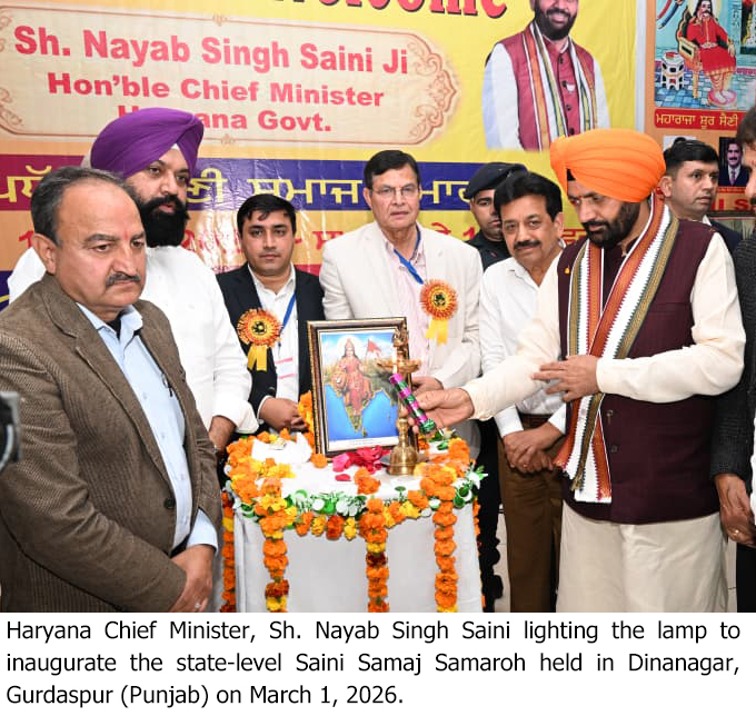 Chandigarh, Mar 1: Haryana Chief Minister Sh. Nayab Singh Saini, while addressing a programme organised by the Saini Samaj at Dinanagar in Gurdaspur district of Punjab on Sunday, said that Punjab is the sacred land of the Gurus, sacrifice and martyrdom. He said that even after suffering the trauma of Partition, the people of Punjab refused to succumb to despair and turned self-belief into their greatest strength. Sh. Nayab Singh Saini said that the upcoming Punjab Assembly election is not merely about changing a government, but about changing the political direction of Punjab and ensuring respect for its society. He said he felt proud to be present on this sacred land. He called upon everyone to work together to once again make Punjab a leading state on the path of development. He said, “Together, we must make Punjab ‘Rangla Punjab’ again.” The Chief Minister said that Prime Minister Sh. Narendra Modi has worked to give due respect to the Saini samaj. By making a small worker like him the Chief Minister, he empowered the community. He informed that on Monday he would present his second Budget in the Haryana Assembly. Out of 217 resolutions, 60 have been fulfilled and work is progressing rapidly on 120 others. Highlighting the state government’s schemes, the Chief Minister said that free dialysis facilities are being provided to kidney patients in all hospitals and medical colleges in Haryana. Pensions are being delivered to senior citizens at their homes by the 10th of every month. Under the Lado Lakshmi Yojana, women are being given Rs. 2,100. Crops are being procured from farmers at the Minimum Support Price (MSP) with payment within 48 hours. Farmers are also benefiting from the Bhavantar Bharpai Yojana. He said houses are being constructed and provided to the poor, and plots are being allotted to families without land. Families residing on Panchayati land for a long time have also been granted ownership rights. |
