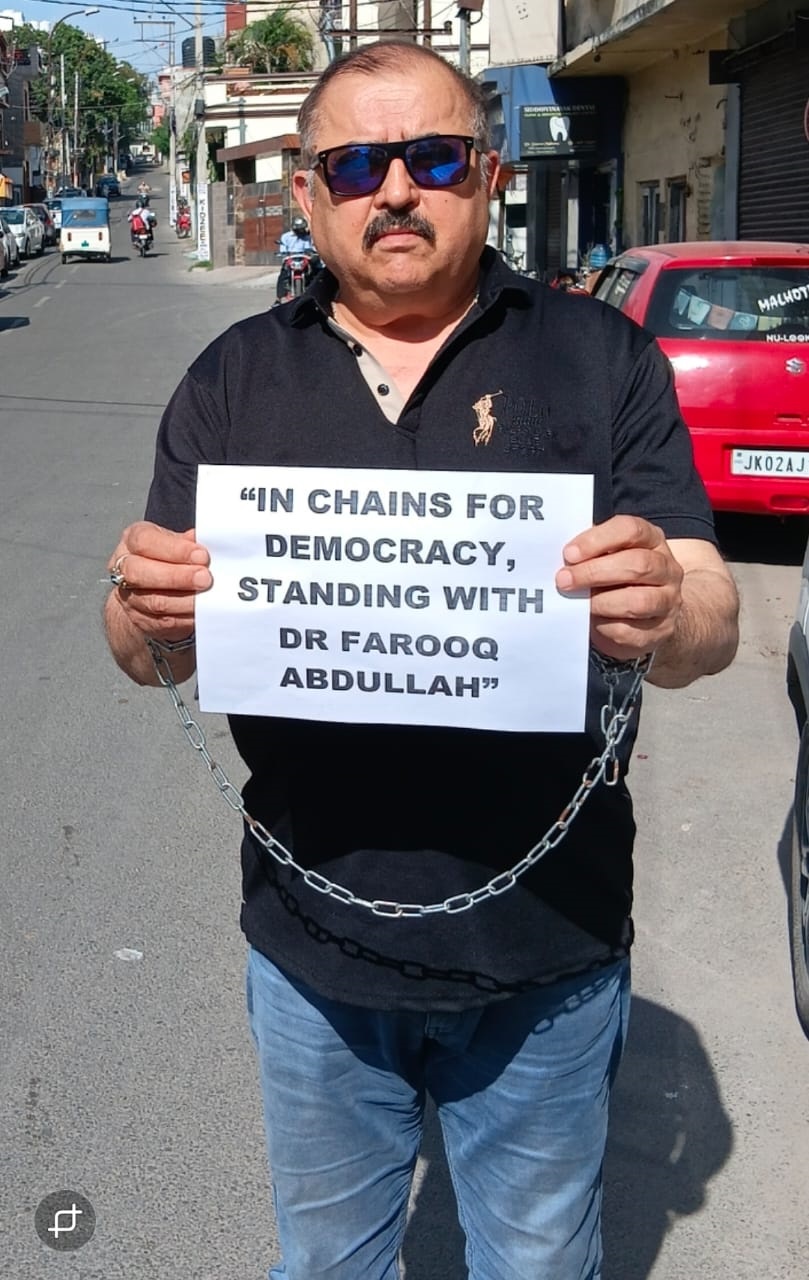 | "In Chains for Democracy: Rajesh Gupta's Roadside Protest for Dr Farooq Abdullah" | | | Early Times Report JAMMU, Mar 14: Senior leader of the Jammu & Kashmir National Conference, Rajesh Gupta, on Saturday staged a unique symbolic protest in Jammu, expressing his unwavering solidarity, loyalty and dedication to party president Farooq Abdullah following the recent assassination attempt on the veteran leader. In a striking act of protest, Gupta stood alone on a roadside with his hands chained, holding a placard that read: "In Chains for Democracy, Standing with Dr Farooq Abdullah." The dramatic gesture drew attention to what he described as a disturbing assault on democratic values. Speaking to reporters, Gupta said the attack on Farooq Abdullah was not merely an isolated act of violence but a deeply alarming incident that exposes serious lapses in the security framework meant to protect senior leaders. He said it is shocking that a leader under the highest category of security could be placed in such immediate danger. Gupta pointed out that events attended by senior political figures normally involve strict security coordination, venue sanitisation and layered policing, yet an armed individual reportedly managed to breach these safeguards and fire at close range. "Only the swift reflexes of a security commando prevented what could have been a major tragedy," he said, adding that security for leaders under state protection cannot depend on miracles. Gupta demanded a transparent and time-bound inquiry to determine where the chain of responsibility failed and called for stronger measures to ensure the safety of public representatives. Reaffirming his solidarity with Farooq Abdullah, Gupta said the people of Jammu and Kashmir will never allow violence or intimidation to silence democratic voices, and the Jammu & Kashmir National Conference will continue to stand firmly in defence of democracy.