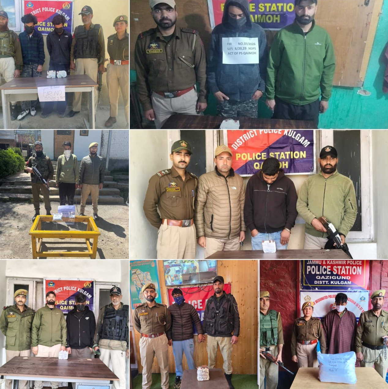 | Kulgam police apprehends 10 drug peddlers | | | Early Times Report KULGAM, Apr 15: In continuation of its sustained drive against drug trafficking and substance abuse, Kulgam police has achieved significant success by apprehending 10 drug peddlers, including 2 in backward linkage, in multiple operations across the district. Additionally, illegal poppy cultivation has been detected and busted. 1st incident - Police Station Qaimoh: During routine naka checking at Khudwani on NHW-44, an auto load carrier bearing registration No. JK18E-0744 was intercepted. During search, 5.16 grams of heroin-like substance was recovered from the dashboard. The driver, Fayaz Ahmad Dar S/O Mohd Shafi Dar R/O Bat Tachloo, was arrested and FIR No. 32/2026 U/S 8/21 NDPS Act registered. Backward linkage: During further investigation, acting on disclosure, another accused ASIF ABBAS DAR S/O Mohd Abbad Dar R/O Batengoo was apprehended near Khudwani Bypass (NHW-44). Upon his search, 1.40 gram of heroin-like substance was recovered. Section 29 NDPS Act was added, establishing backward linkage. 2nd incident - Police Station Qazigund: During naka checking at Levdoora near the flyover, one suspicious person identified as Saqib Manzoor Itoo S/O Manzoor Ahmad Itoo R/O Wanpoh was apprehended. Upon personal search, 5.05 grams of heroin-like substance was recovered. FIR No. 73/2026 U/S 8/21 NDPS Act stands registered. 3rd incident - Police Station Devsar: During patrolling at General Road Arrigatnoo near a public park, one person identified as Adil Manzoor Ganie S/O Manzoor Ahmad Ganie R/O Kulgam was apprehended. Upon his search, Approx. 120 grams of cannabis-like substance and 2 grams of brown sugar-like substance were recovered along with a mobile phone and driving licence. FIR No. 20/2026 U/S 8/20, 21 NDPS Act has been registered. 4th incident - Police Post Mir Bazar: During naka duty at NHW near Zadoora, a naka party intercepted an auto load carrier bearing registration No. JK18C-6457. During checking, a polythene bag concealed inside the driver's seat was recovered. Upon search, charas powder-like substance weighing approx. 119 grams was recovered. The accused Junaid Salam Mengroo S/O Ab Salam Nengroo R/O Badroo Yaripora Kulgam was arrested. FIR No. 75/2026 U/S 8/20 NDPS Act registered. 5th incident - Police Station Qaimoh: Two persons who attempted to flee during naka checking at Khudwani near SKAUST were apprehended. They were identified as: Jasir Imtiyaz S/O Imtiyaz Hussain Ganie R/O Karigam, Qazigund Basit Ahmad Kaloo S/O Javaid Ahmad Kaloo R/O Sopore On search, charas-like substance (20 grams - 10 grams each) was recovered. FIR No. 33/2026 U/S NDPS Act registered. Backward linkage: On disclosure, Amir Maqbool S/O Mohd Maqbool R/O Badderpora Qaimoh was arrested and 29.08 grams of Cannabis-like substance recovered. Section 29 NDPS Act invoked. 6th incident - Police Station Qazigund: During naka duty, one person Ghulam Mohi Din Khan S/O Mohd Afzal Khan R/O Kalian, Devsar was apprehended. Ganja-like substance weighing approx. 1 kg 350 grams was recovered from a rice bag. FIR No. 76/2026 U/S 8/20 NDPS Act registered. 7th incident - Police Station Devsar (Poppy Cultivation): At Village Sopat, land measuring 2.42 marlas was found under illegal poppy cultivation. The land was found in possession of Ab Rasheed Mir S/O Sanaullah Mir R/O Sopat. FIR No. 21/2026 U/S 8/18 NDPS Act registered and cultivation destroyed. 8th incident - Police Post Jawahar Tunnel. During naka duty at Sadiwara Dooru Road at about 10:40 hrs, one person attempted to flee on noticing the police party but was apprehended tactfully. He disclosed his identity as Arif Hussain Wani W/o Ab. Rehman Wani R/o Nadoora. During personal search, poppy straw weighing approx. 1 kg 700 grams was recovered. Accordingly, FIR No. 79/2026 U/S 8/15 NDPS Act has been registered and investigation taken up. All accused persons have been arrested and further investigation is in progress to identify the source and dismantle the entire narcotics network. SSP Kulgam, Anayat Ali Choudhary (IPS) appealed to the general public to support Police in the fight against drug menace. He urged citizens to share any information related to drug peddling, assuring strict confidentiality. Kulgam police remains committed to its zero-tolerance policy against drugs. |