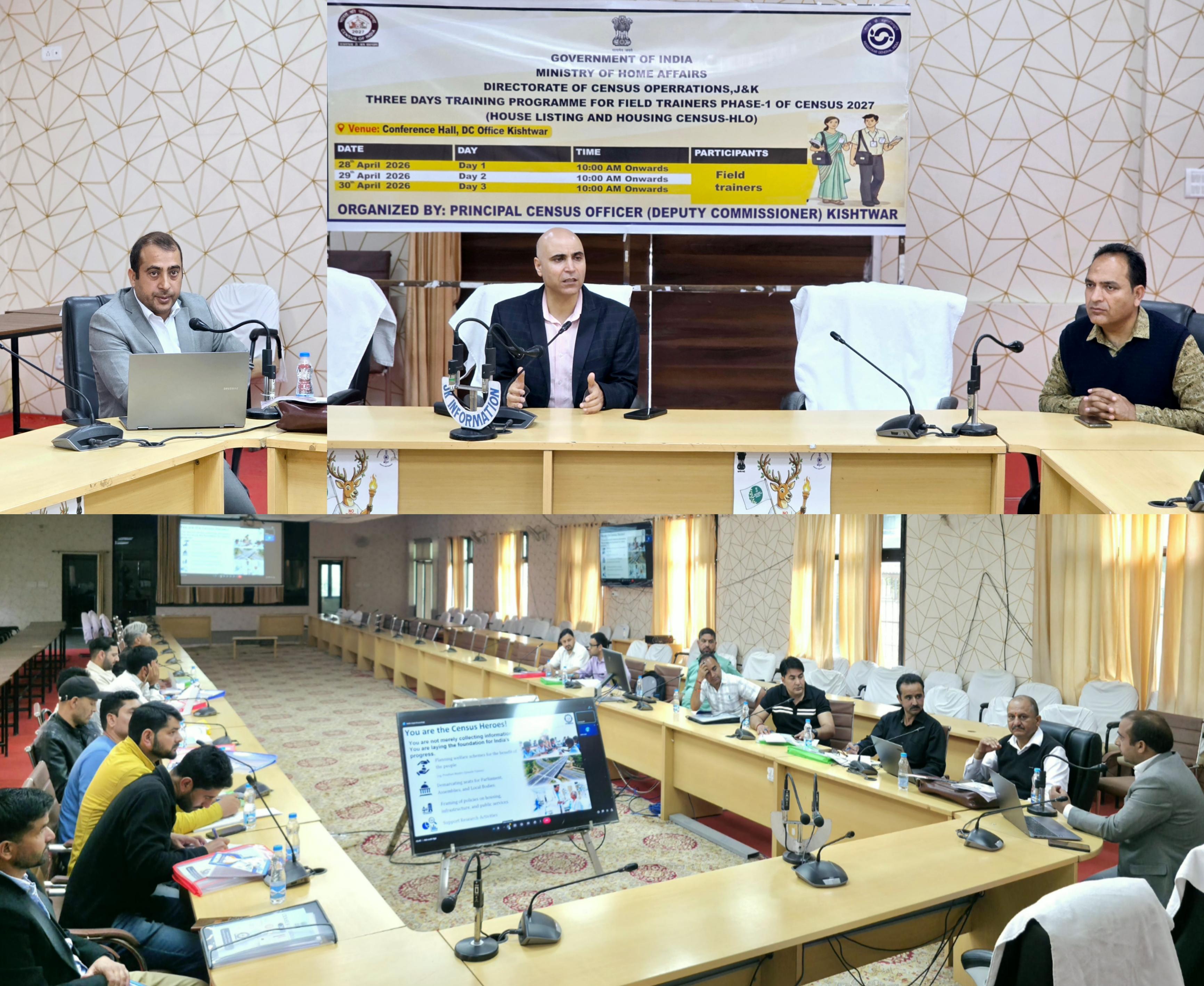KISHTWAR, Apr 28: The District Administration Kishtwar (Principal Census Office, Kishtwar), under the chairmanship of the Deputy Commissioner (Principal Census Officer) Pankaj Kumar Sharma and in collaboration with the Directorate of Census Operations J&K, today commenced a comprehensive three-day training programme for Field Trainers to further train the Field functionaries for the upcoming Census 2027. The three-day training programme is being conducted with the objective of preparing field functionaries for effective execution of census duties. The training is being imparted to the Field Trainers by officials from the Directorate of Census Operations J&K including Assistant Director (Census Operations Office Jammu), Balbir Singh; Master Trainer and others. A total of 12 field trainers are participating in the programme and undergoing intensive training. The participants are being acquainted with key aspects of census methodology, data collection techniques, use of digital tools and field-level coordination mechanisms to ensure accurate and efficient enumeration. The training shall focus on the House Listing and Housing Census (HLO)- the Phase-I of census to equip field functionaries with the necessary skills for accurate and efficient enumeration. Addressing the participants, the Deputy Commissioner underscored the significance of the Census as one of the most critical national exercises. Highlighting the unique geographical challenges of Kishtwar including its vast terrain and sparse population, he urged enumerators to ensure complete coverage and accuracy by visiting every household without exception. Emphasizing precision in data collection, he called upon the field staff to meticulously record all 34 prescribed parameters, reiterating the guiding principle of the exercise: “Every citizen counts.” The first day of the training concluded with an interactive question-and-answer session, wherein participants actively engaged with the trainers and sought clarifications on various operational aspects. The programme was attended by DSEO Kishtwar Suresh Sharma (ADCO), Field Trainers and other concerned staff associated with the Census. |
