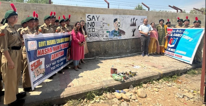 | GDC Khour organizes Wall Painting drive under Nasha Mukt Bharat Abhiyan | | | Early Times Report KHOUR, Apr 30: Government Degree College Khour organized a wall painting activity on 30th April under the Nasha Mukt Bharat Abhiyan (NMBA) to spread awareness about the harmful effects of drug abuse and to promote a drug-free society. The programme was conducted under the guidance of the worthy Principal, Prof. (Dr.) T.K. Sharma, who appreciated the initiative and encouraged students to actively participate in awareness campaigns promoting a drug-free and healthy lifestyle. He emphasized the role of youth in building a responsible and addiction-free society. The wall painting activity was carried out by NCC cadets of the college under the supervision of Prof. Shivani Sharma, ANO and Nodal Officer of NMBA. Dr. Sapna Narania and Dr. Pooja Kumari also supervised the event and guided the students throughout the activity. Through their creative artwork, the cadets conveyed strong anti-drug messages and emphasized the importance of leading a healthy and drug-free life. The programme concluded with the NMBA pledge, wherein all participants took an oath to contribute towards building a drug-free society and to spread awareness in their respective communities. All committee members were present on the occasion, including Prof. Jozafeen Afzal and Dr. Anjana Sharma. |